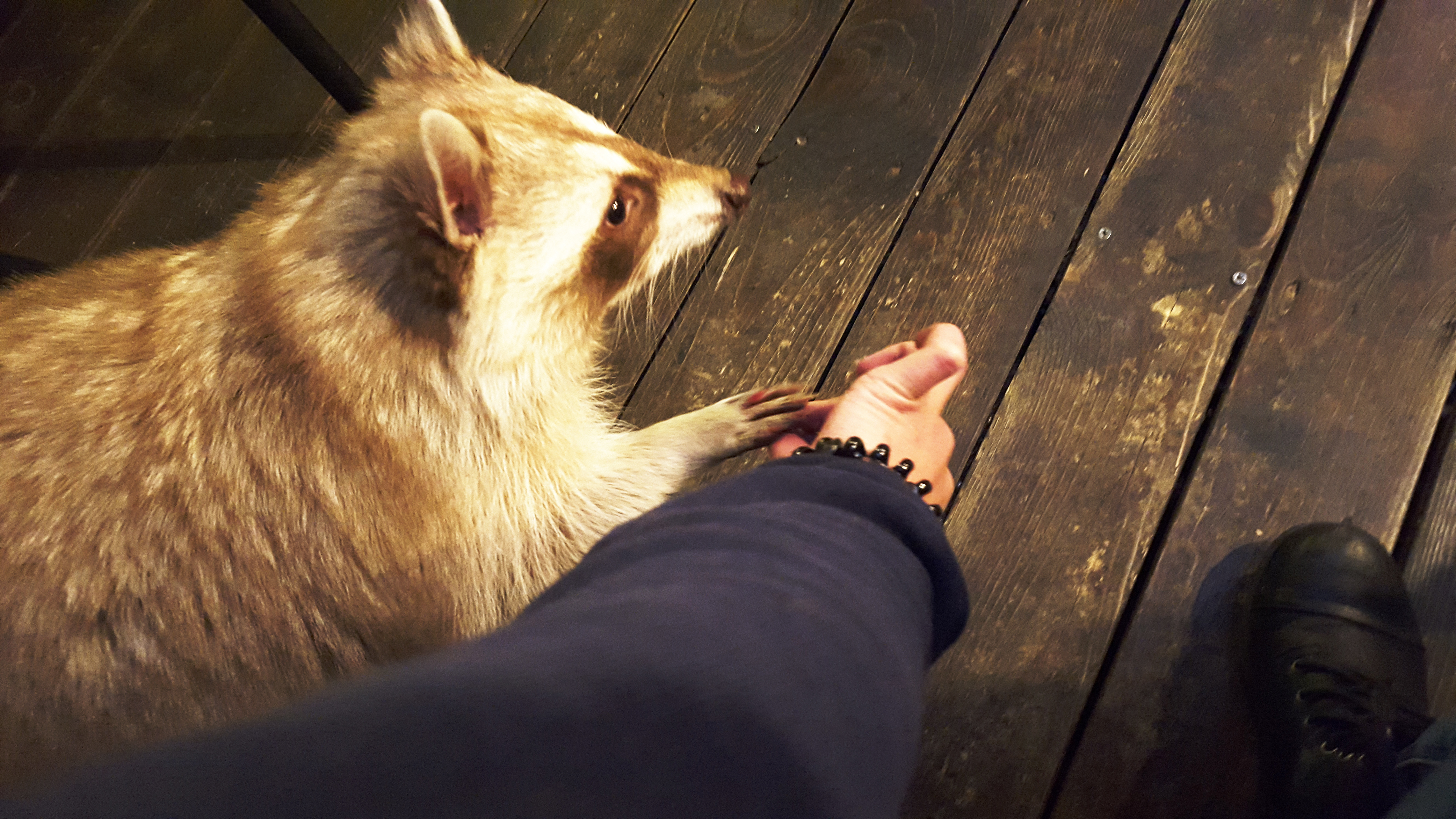 One of the raccoons were asleep when we went, so everyone was crowded around and trying to get the attention of the only other one awake. We didn’t get a lot of personal interaction as a result, but it did come up to me when I had a treat.